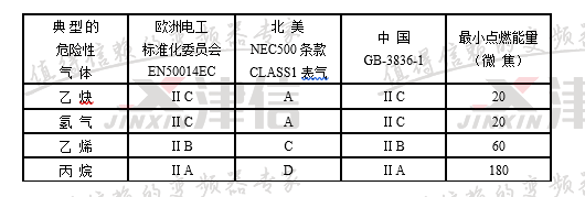 注:中國GB3836標準規定ⅡC級最小點燃能量為19微焦耳,ⅡA級最小點燃能量為200微焦耳。